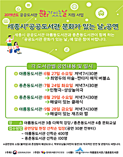 ¼¼Á¾½Ã ¾Æ¸§µ¿µµ¼­°ü°ú Á¾Ã̵¿µµ¼­°üÀÌ ¡®2018³â °ø°øµµ¼­°ü ¹®È­°¡ ÀÖ´Â ³¯¡¯Çà»ç·Î ÀÌ´ÞºÎÅÍ 9¿ù±îÁö ¸¶¼ú, ÀÎÇü±Ø, Ŭ·¡½Ä µî ´Ù¾çÇÑ ¹®È­°ø¿¬À» ÆîÄ£´Ù.