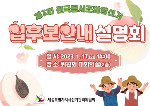 ¼¼Á¾Æ¯º°ÀÚÄ¡½Ã¼±°Å°ü¸®À§¿øÈ¸(ÀÌÇÏ¡®¼¼Á¾½Ã¼±°üÀ§¡¯)´Â 3¿ù 8ÀÏ ½Ç½ÃÇÏ´Â Á¦3ȸ Àü±¹µ¿½ÃÁ¶ÇÕÀå¼±°Å¸¦ ¾ÕµÎ°í ¿À´Â 1¿ù 17ÀÏ ¿ÀÈÄ 2½ÃºÎÅÍ ¼¼Á¾½Ã¼±°üÀ§ 2Ãþ ´ëȸÀǽǿ¡¼ ÀÔÈĺ¸¾È³» ¼³¸íȸ¸¦ °³ÃÖÇÑ´Ù°í ¹àÇû´Ù.