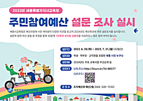 ¼³¹®Àº ¼¼Á¾½Ã±³À°Ã» ´©¸®Áý-ÁÖ¹ÎÂü¿©¿¹»êÁ¦-¼³¹®Á¶»ç¿¡¼­ Âü¿©Çϰųª Á¤º¸¹«´Ì(QRÄÚµå)¸¦ ÅëÇØ ¸ð¹ÙÀϷεµ °¡´ÉÇÏ´Ù.